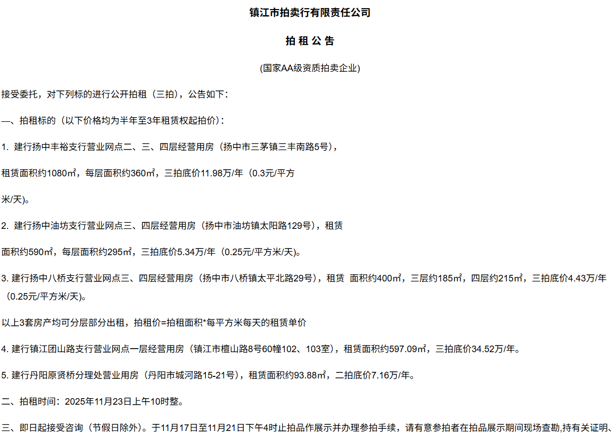 鎮江市拍賣行有限責任公司拍 租 公 吿(國家AA級資質拍賣企業)接受委托,對下列標的進行公開拍租(三拍),公告如下:—、拍租標的(以下價格均為半年至3年租賃權起拍價):1.  建行揚中豐裕支行營業網點二、三、四層經營用房(揚中市三茅鎮三豐南路5號),租賃面積約1080㎡,每層面積約360㎡,三拍底價11.98萬/年(0.3元/平方米/天)。2.  建行揚中油坊支行營業網點三、四層經營用房(揚中市油坊鎮太陽路129號),租賃面積約590㎡,每層面積約295㎡,三拍底價5.34萬/年(0.25元/平方米/天)。3. 建行揚中八橋支行營業網點三、四層經營用房(揚中市八橋鎮太平北路29號),租賃  面積約400㎡,三層約185㎡,四層約215㎡,三拍底價4.43萬/年(0.25元/平方米/天)。以上3套房產均可分層部分出租,拍租價=拍租面積*每平方米每天的租賃單價4. 建行鎮江團山路支行營業網點一層經營用房(鎮江市檀山路8號60幢102、103室),租賃面積約597.09㎡,三拍底價34.52萬/年。5. 建行丹陽原賢橋分理處營業用房(丹陽市城河路15-21號),租賃面積約93.88㎡,二拍底價7.16萬/年。二、拍租時間:2025年11月23日上午10時整。三、即日起接受咨詢(節假日除外)。于11月17日至11月21日下午4時止拍品作展示并辦理參拍手續,請有意參拍者在拍品展示期間現場查勘,持有關證明、簽署相關說明、繳納相應的參拍保證金辦理參拍手續。四、咨詢、拍租地點:鎮江市長江路9號五、聯系方式:0511-85275988   13655299933楊先生六、網址:http://www_zjauction_net.joy-williams.com;微信公眾號:搜索“鎮江市拍賣行” 拍品清單2025.11.23序號名稱起拍價(元)標的說明1建行揚中豐裕支行營業網點二、三、四層經營用房(揚中市三茅鎮三豐南路5號),租賃面積約1080㎡,每層面積約360㎡三拍底價11.98萬/年(0.3元/平方米/天)1、1-3號房產均可分層部分出租,拍租價=拍租面積*每平方米每天的租賃單價;2、意向競拍人在拍賣前需持營業執照或身份證與委托方說明租賃房產經營業態,確定意向后出具房產承租用途承諾書,經委托方審核后,方可交納保證金參加競拍;3、租賃期限為半年至3年(承租方與出租方協商而定),承租方每半年或一年結付租金,租賃期間的水、電費用及其它相關費用均由承租方承擔;4、承租方不得用于經營和保管危險物品,不得用于開設餐飲、娛樂等可能嚴重影響消防安全、運營安全的經營業態,不得用于經營委托貸款、小額貸款等可能冒用委托方名義,帶來聲譽風險的經營業態。租賃期內,承租方不得破壞墻體結構,自行成就消防、安全等使用條件,不得擅自將租賃房屋轉租、轉讓給他人使用,否則委托方有權收回房屋;5、拍租成交后,承租方將租金交至出租方指定賬戶,傭金交至拍賣方賬戶(拍租傭金為該房屋一個月租金)。承租方憑租賃合同無息退還保證金。2建行揚中油坊支行營業網點三、四層經營用房(揚中市油坊鎮太陽路129號),租賃面積約590㎡,每層面積約295㎡三拍底價5.34萬/年(0.25元/平方米/天)3建行揚中八橋支行營業網點三、四層經營用房(揚中市八橋鎮太平北路29號),租賃面積約490㎡,每層面積約245㎡三拍底價4.43萬/年(0.25元/平方米/天)4建行鎮江團山路支行營業網點一層經營用房(鎮江市檀山路8號60幢102、103室),建筑面積約597.09㎡三拍底價34.52萬/年5建行丹陽原賢橋分理處營業用房(丹陽市城河路15-21號),建筑面積約93.88㎡二拍底價7.16萬/年